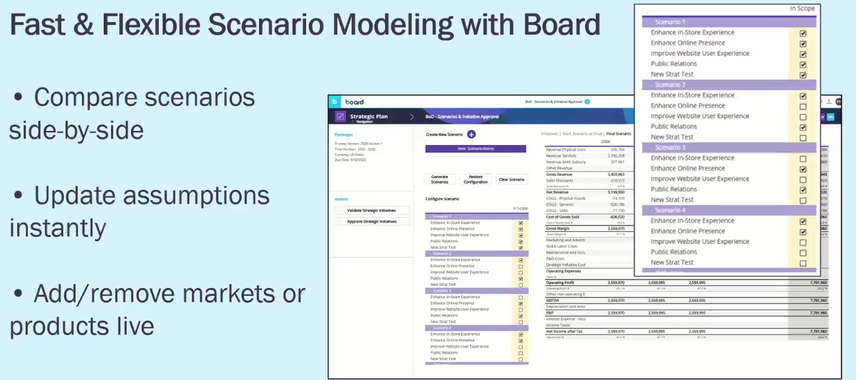 An example Justin described with Board, if you’re asked to model a 10% price increase, you can generate a new scenario very quickly and run that analysis. Board updates everything in real time as one assumption change updates all related figures immediately across all dimensions, unlike spreadsheets where changes would require manual consolidation (or inputs) across dozens of sheets.