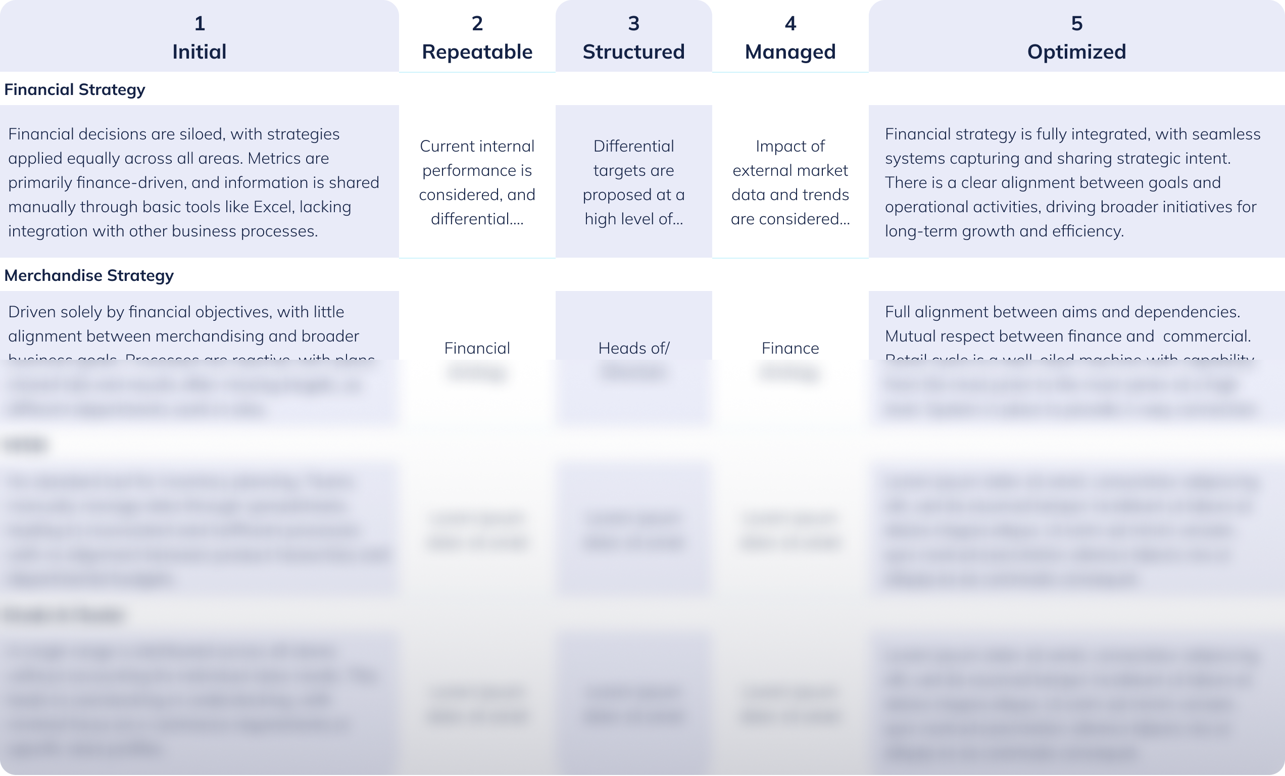 The Maturity Matrix outlines five stages of development, from Initial to Optimized. Each stage provides clear action points to help you improve your processes and move closer to achieving fully integrated, data-driven, and scalable planning.